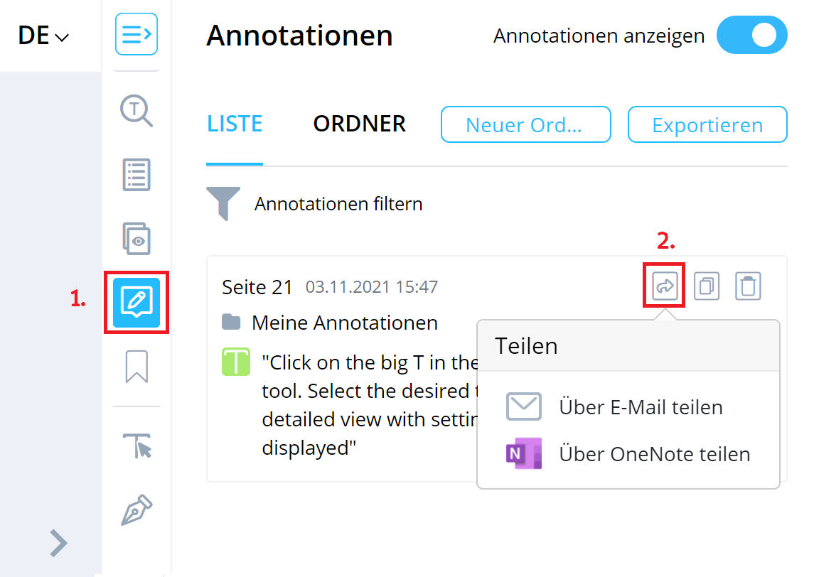 - Klicken Sie dazu auf das Icon für die Annotationen am rechten Rand von Edubase (oder direkt in Ihrer Annotation).